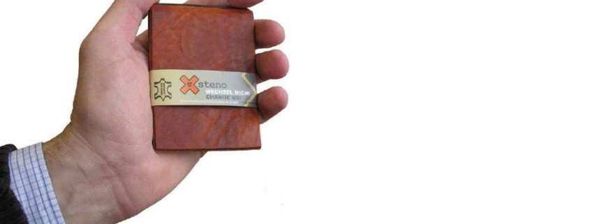 Steno können heute wohl die wenigsten, aber wenn man sich schnell was notieren muss, ist unser X-Steno wohl die perfekte Lösung! Es passt in jede Tasche, es hat mit Din-A-7 genau die richtige Größe und es trägt nicht auf, da in der Hülle genau ein Heft seinen Platz findet! Das Heft wird natürlich mit einem Elastix befestigt, in diesem Fall aber oben, man blättert also von unten nach oben, wie bei einem Reporter-Block!
