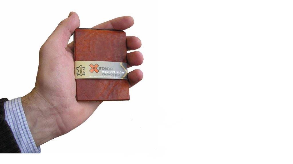 Steno können heute wohl die wenigsten, aber wenn man sich schnell was notieren muss, ist unser X-Steno wohl die perfekte Lösung! Es passt in jede Tasche, es hat mit Din-A-7 genau die richtige Größe und es trägt nicht auf, da in der Hülle genau ein Heft seinen Platz findet! Das Heft wird natürlich mit einem Elastix befestigt, in diesem Fall aber oben, man blättert also von unten nach oben, wie bei einem Reporter-Block!