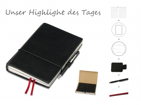 Unser Highlight des Tages heute (19.12.2013) zum Beispiel ist ein A6 LeatherSkin Komplett-Paket in schwarz mit Kalender, Notizen und Zubehör. Das ganze verschicken wir in einer praktischen Geschenkbox!