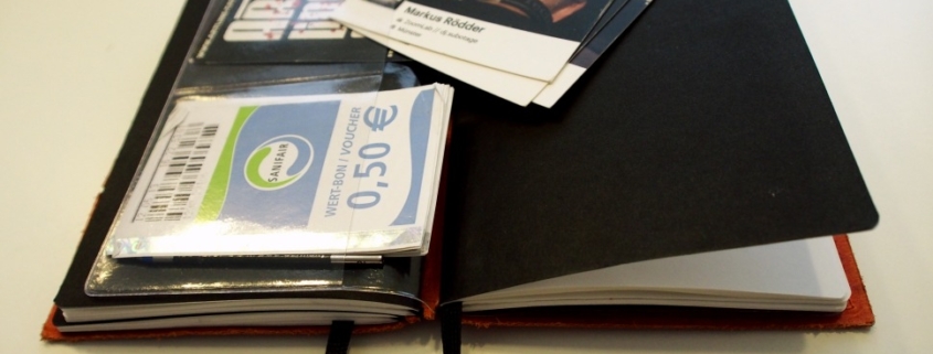 Mit einer Doppeltasche hat man somit Platz für Fotos oder Quittungen (in der hinteren großen Hülle) und für Visit- oder Kreditkarten (in den 2 vorderen Hüllen).