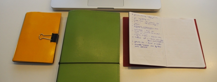 Weiterhin benutze ich 2 X47 Steel. Ein rotes für das Thema Musik, wo Titel und Künstler reinkommen, die ich noch anhören will oder muss, mp3s die ich noch kaufen möchte, bisher unbekannte Remixe und Neuigkeiten, die man im Internet oder auf Mixtapes hört. Da schreibe ich im Grunde täglich mehrfach rein! Das zweite X47 Steel Büchlein ist mein „Travelbook“, das ich immer mitnehme, wenn ich auf Reisen bin. Quasi ein Reise-Tagebuch. Gedanken, Ideen, Adressen, Hotels, die man empfehlen kan (oder auch nicht) und vieles mehr. Quittungen und wichtige Erinnerungen (Eintrittskarten etc.) lege ich in der Doppeltasche ab.