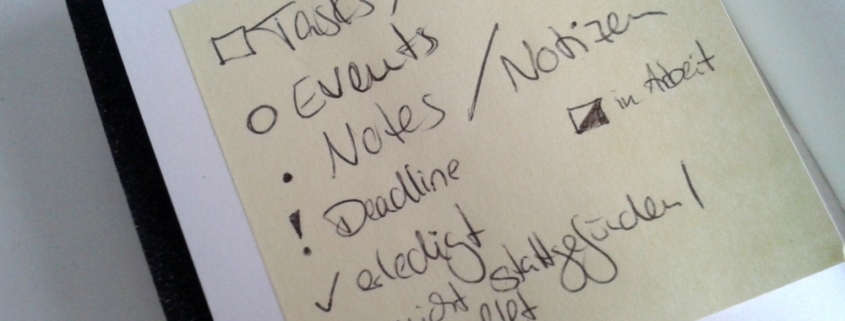 Ideen und Aufgaben sind ebenso zentrale Dinge, die sich in meinem Notizbuch wieder finden. Nach dem neuen Bullet Journal-Prinzip versammele ich Ideen nun auf einer eigenen Seite im Notizbuch. Die Aufgaben finden sich unter dem jeweiligen Tag wieder. Durch den Index am Anfang des Bullet Journals und die Seitenzahlen lassen sich diese Seiten schnell wieder finden.