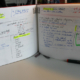 Im oberen Teil der Seite des Notizbuchs notiere ich die wichtigsten Aufgaben und teilweise auch Termine. Im Hauptfeld ist Platz für alles, was ich am Tag erledigen muss. Kurze Notizen aus Telefongesprächen, Mitschriften aus Meetings oder neue Aufgaben, die sich ergeben, finden auch Platz. Was ich nicht erledigt habe, markiere ich mit einem grünen Textmarker. Die Markierung finde ich schnell wieder und brauche den Eintrag nicht nochmal aufschreiben. Bislang habe ich fast für jeden Arbeitstag eine Seite mit Notizen befüllt. Ich empfinde das Querformat als wirklichen Vorteil, weil die zu schreibenden Zeilen länger sind als im Hochformat. Ich schreibe hauptsächlich mit Uniball-Tintenschreiber von Faber Castell in unterschiedlichen Farben und in der feinsten Stiftstärke.