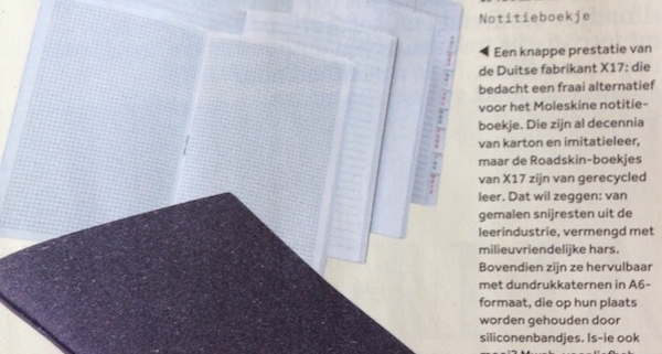 Übersetzung des Artikels: Eine beachtliche Leistung des deutschen Produzenten von X17: Er erfand eine gelungene Alternative zum beliebten Moleskine-Notizbuch. Die sind schon jahrzehntelang aus Pappe und Lederimitat, die Roadskin-Notizbücher von X17 jedoch sind aus recycletem Leder. Das heiβt: zermahlene Reste aus der Lederwarenindustrie, vermischt mit umweltfreundlichem Harz. Auβerdem sind sie nachfüllbar mit Dünndruckheftchen im A6-Format, die mit einem Silikonenband festgehalten werden. Sieht es auch schön aus? Naja – für Asphaltliebhaber ganz bestimmt. Es gibt auch Varianten mit roter oder grüner Beschichtung.