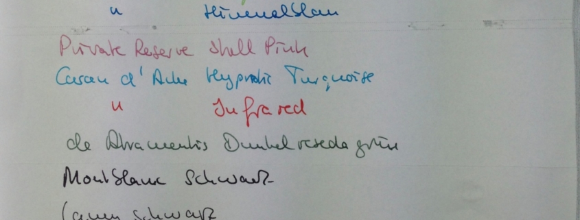 Dazu schrieb Simone de Saree: „Mit den Tinten, die `funktionieren` wäre ich aber etwas vorsichtig. Was definitiv gut geht, sind die Kaweco-Tinten, vor allem das Blauschwarz, mit einem Otho-Füller (der passt auch hervorragend in die Stiftschlaufe!). Meine Tests habe ich sonst mit einem Lamy Safari gemacht (Stahlfeder in EF). Ich weiss aber auch, dass z.B. Shell Pink (wie schon geschrieben) und Faber Castell „Stone Grey“ mit einem Montblanc Mozart und F Feder durchschlagen. Zudem habe ich erst das Blatt herausgetrennt und dann auf einem japanischen Schreibbrett (Shitajiki) geschrieben, ich würde daher den Test gerne noch einmal mit einem im Heft eingehefteten Blatt und einem Füller mit Goldfeder wiederholen.“