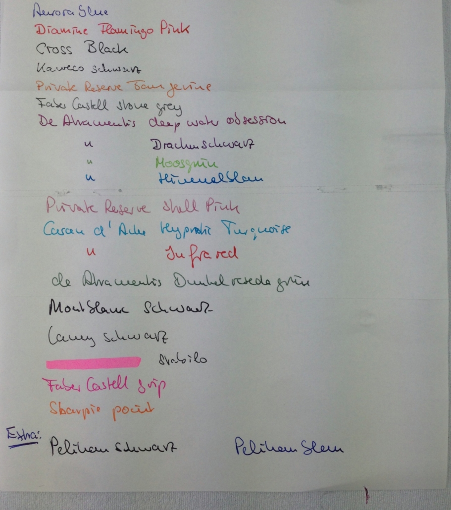 Dazu schrieb Simone de Saree: „Mit den Tinten, die `funktionieren` wäre ich aber etwas vorsichtig. Was definitiv gut geht, sind die Kaweco-Tinten, vor allem das Blauschwarz, mit einem Otho-Füller (der passt auch hervorragend in die Stiftschlaufe!). Meine Tests habe ich sonst mit einem Lamy Safari gemacht (Stahlfeder in EF). Ich weiss aber auch, dass z.B. Shell Pink (wie schon geschrieben) und Faber Castell „Stone Grey“ mit einem Montblanc Mozart und F Feder durchschlagen. Zudem habe ich erst das Blatt herausgetrennt und dann auf einem japanischen Schreibbrett (Shitajiki) geschrieben, ich würde daher den Test gerne noch einmal mit einem im Heft eingehefteten Blatt und einem Füller mit Goldfeder wiederholen.“