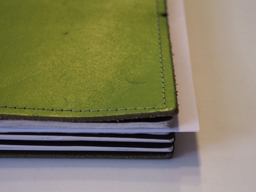 In das Notizbuch A5+ Quer passen gefaltete Din-A4 Zettel problemlos rein und es schaut nichts hinaus. Ganz wichtige, oder dauerhafte Dokumente könnt Ihr auch in die Doppeltasche stecken.