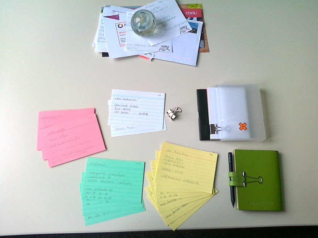 So war ich sehr interessiert, als die Mind-Papers-Idee an mich herange-tragen wurde. Ich habe meine mehr oder weniger wilde private Zettelwirtschaft in eine sinnvolle Ordnung gebracht, durch die Beschränkung auf ein einheitliches Format wird dieses gesammelte Wissen auch transportierbar. Die Gruppen habe ich farblich von einander getrennt, so dass ich sie auf einen Blick wiederfinde. Durch den Einsatz einzelner Karteikarten trage ich auch nur die Informationen mit mir herum, die ich wirklich benötige; der Rest wird abgelegt. Wenn Karten nicht mehr relevant sind, werfe ich sie weg.