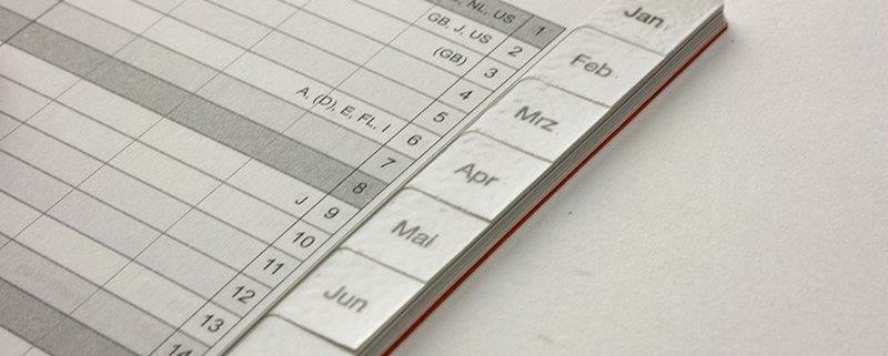 Die Produktion von Monatsplanern ist sehr aufwendig, daher werden diese als Heft später ausgeliefert. Nach dem Layouten und Prüfen der Daten (immerhin für 3 Jahre(!)) muss das Heft produziert werden. Anders als bei den Tages- und Wochenkalendern braucht der Monatskalender aber noch eine Registerstanzung inkl. Lackierung.