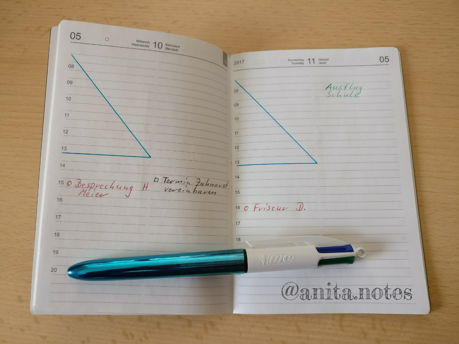 Für die Terminplanung streiche ich feste Zeiten (Fortbildung Finanz-/Lohnbuchhaltung bis 13.30 Uhr) gleich weg, damit ich diese nicht mehr für Termine einplane. Termine werden mit rot eingetragen, nach Erledigung der Kreis durchgekreuzt. Aufgaben sind schwarz mit Kästchen und sonstige Anmerkungen grün. Die Stempelfarbe auf den schwarzen Covern ist Pigmentfarbe. Diese ist ähnlich wie Kreide und daher auch auf schwarz verwendbar. – anita.notes