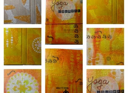 Ich habe mich für eine Hülle aus Leder-Fasermaterial in der Farbe natur entschieden. Die Hülle habe ich dann erstmal mit Gesso grundiert, dann mit Papierschnipseln beklebt und mit Strukturpaste und diversen Farben (u.a. Acrylfarbe, Dylusion Spray Inks, Gelatos…) bearbeitet und natürlich auch ein bisschen bestempelt (StazOn schwarz). Zum Schluss habe ich alles mit Acryl Medium versiegelt. Einziger Schwachpunkt: die Papierschnipsel, die um den Buchrücken gehen, sind ein bisschen eingerissen und werfen etwas Falten. Da hätte ich dünneres Papier verwenden sollen. (Quelle: http://www.millefeuille.eu/?p=4461)
