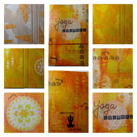 Ich habe mich für eine Hülle aus Leder-Fasermaterial in der Farbe natur entschieden. Die Hülle habe ich dann erstmal mit Gesso grundiert, dann mit Papierschnipseln beklebt und mit Strukturpaste und diversen Farben (u.a. Acrylfarbe, Dylusion Spray Inks, Gelatos…) bearbeitet und natürlich auch ein bisschen bestempelt (StazOn schwarz). Zum Schluss habe ich alles mit Acryl Medium versiegelt. Einziger Schwachpunkt: die Papierschnipsel, die um den Buchrücken gehen, sind ein bisschen eingerissen und werfen etwas Falten. Da hätte ich dünneres Papier verwenden sollen. (Quelle: http://www.millefeuille.eu/?p=4461)
